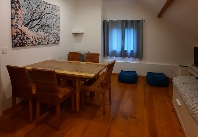 Grande cuisine/séjour, lave-vaisselle, lave-linge, climatisation, parking privé.
